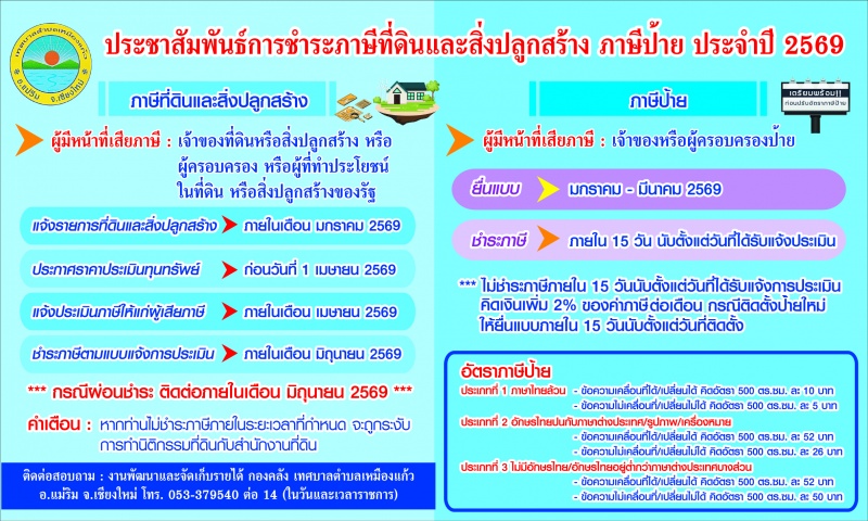 ประชาสัมพันธ์การชำระภาษีที่ดินและสิ่งปลูกสร้าง ภาษีป้าย ประจำปี 2569