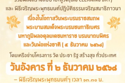 ขอประชาสัมพันธ์เชิญชวนเข้าร่วมกิจกรรมรวมพลังสร้างสัปปายะสู่วัดด้วยวิถี 5 ส เนื่องในโอกาสวันพระบรมราชสมภพพระบาทสมเด็จพระบรมชนกาธิเบศร มหาภูมิพลอดุลยเดชมหาราช บรมนาถบพิตร และวันพ่อแห่งชาติ (วันพ่อแห่งชา