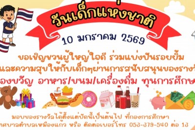 ขอประชาสัมพันธ์เชิญชวนผู้ใหญ่ใจดี ร่วมแบ่งปันรอยยิ้ม และความสุขให้กับเด็กๆผ่านการสนับสนุนของรางวัล โครงการวันเด็กแห่งชาติ ประจำปี 2569