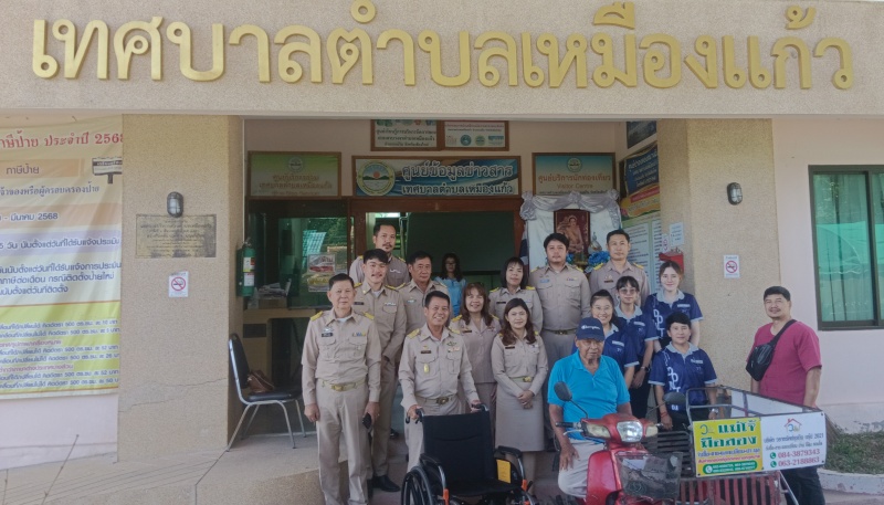 คณะผู้บริหารและสมาชิกสภาเทศบาลตำบลเหมืองแก้ว มอบอุปกรณ์ช่วยเหลือคนพิการ รถเข็นนั่ง (Wheelchair) ให้แก่ผู้พิการในเขตเทศบาลตำบลเหมืองแก้ว เพื่อใช้ในชีวิตประจำวันหรือเพื่อเป็นสิ่งอำนวยความสะดวกในการประกอบอาชีพ