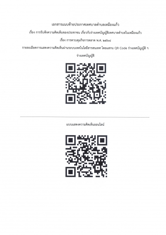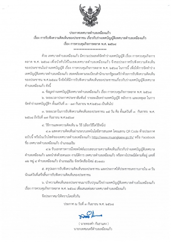 เชิญชวนประชาชนร่วมแสดงความคิดเห็นของประชาชน ร่างเทศบัญญัติเทศบาลตำบลเหมืองแก้ว เรื่อง การควบคุมกิจการตลาด พ.ศ.2568