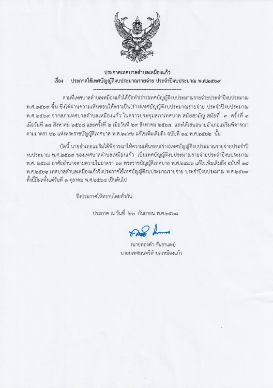 ประชาสัมพันธ์ประกาศใช้เทศบัญญัติงบประมาณรายจ่ายประจำปีงบประมาณ พ.ศ.2569