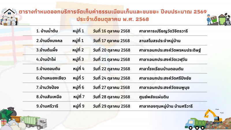 >> ประชาสัมพันธ์การชำระค่าธรรมเนียมเก็บและขนขยะ เดือนตุลาคม พ.ศ. 2568 ปีงบประมาณ 2569