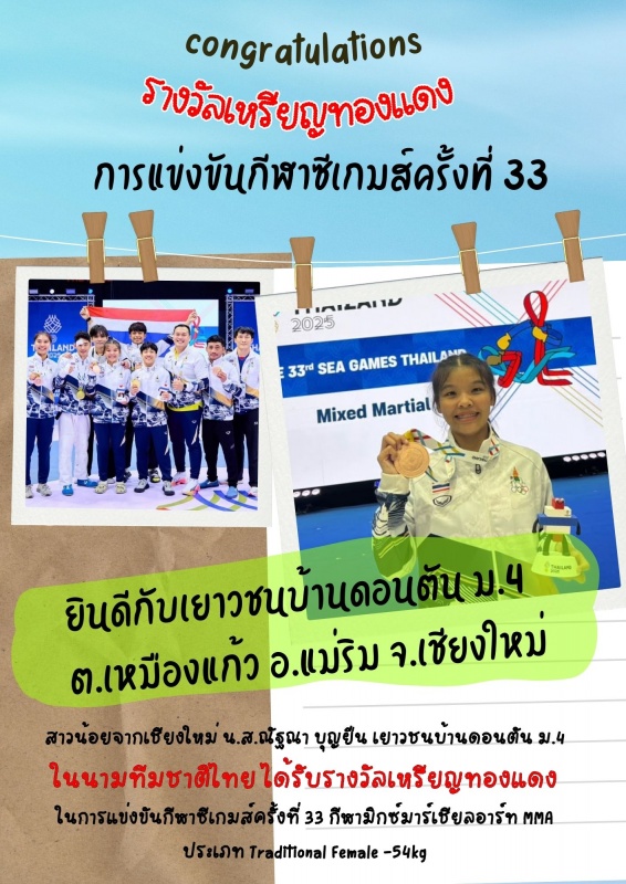 เทศบาลตำบลเหมืองแก้วร่วมยินดีกับเยาวชนในตำบลเหมืองแก้ว ตัวแทนทีมชาติไทย เข้าร่วมการแข่งขันกีฬาซีเกมส์ครั้งที่ 33 ได้รับรางวัลเหรียญทองแดงประเภท Traditional Female - 54 kg