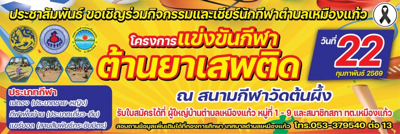 ขอประชาสัมพันธ์เชิญชวนร่วมกิจกรรมและเชียร์นักกีฬาตำบลเหมืองแก้ว โครงการแข่งขันกีฬาต้านยาเสพติด ประจำปี 2569